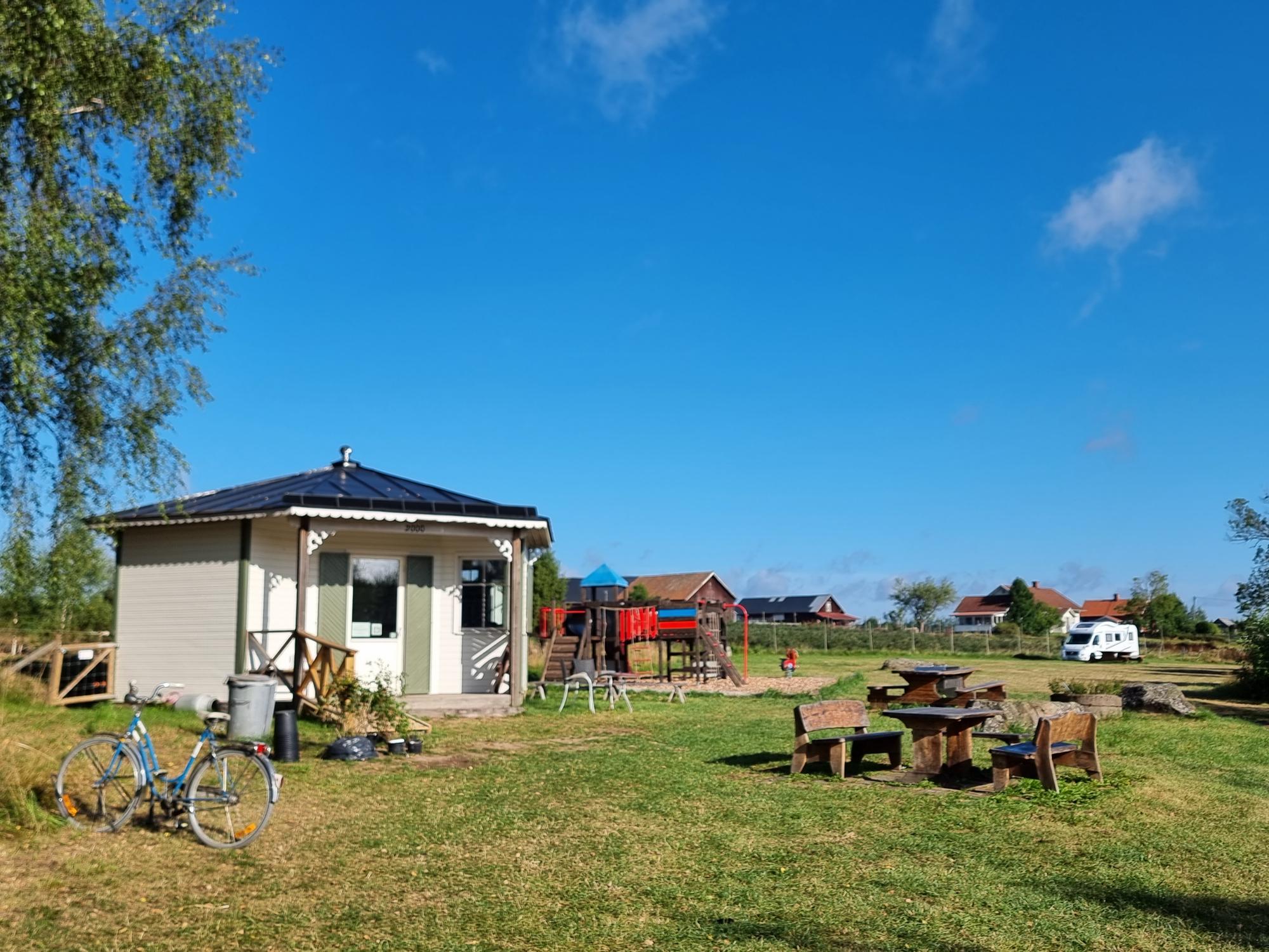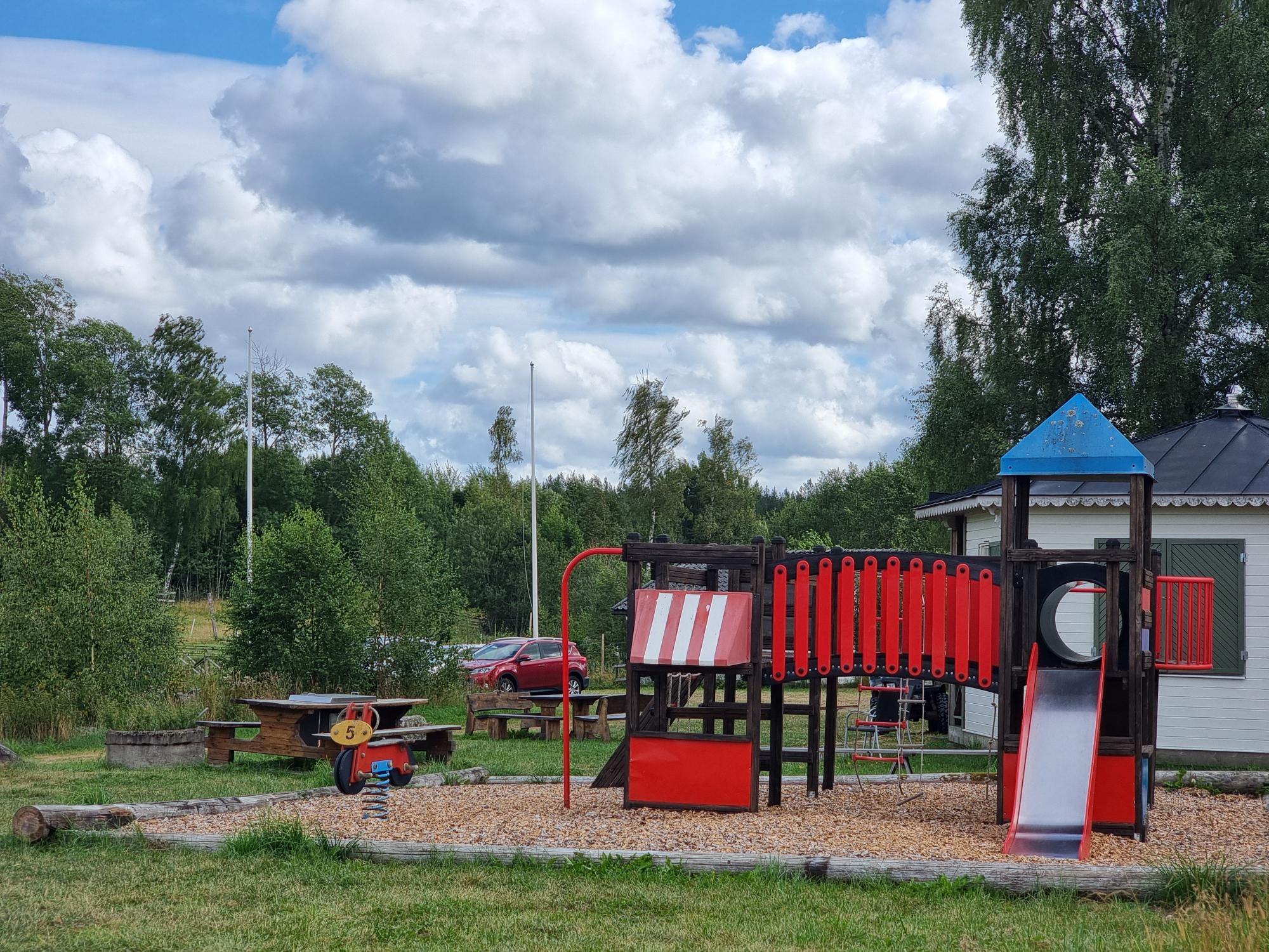 För de yngre besökarna finns en lekplats där barnen kan leka fritt medan de vuxna njuter av kaffe, samtal och lugnet på gården.